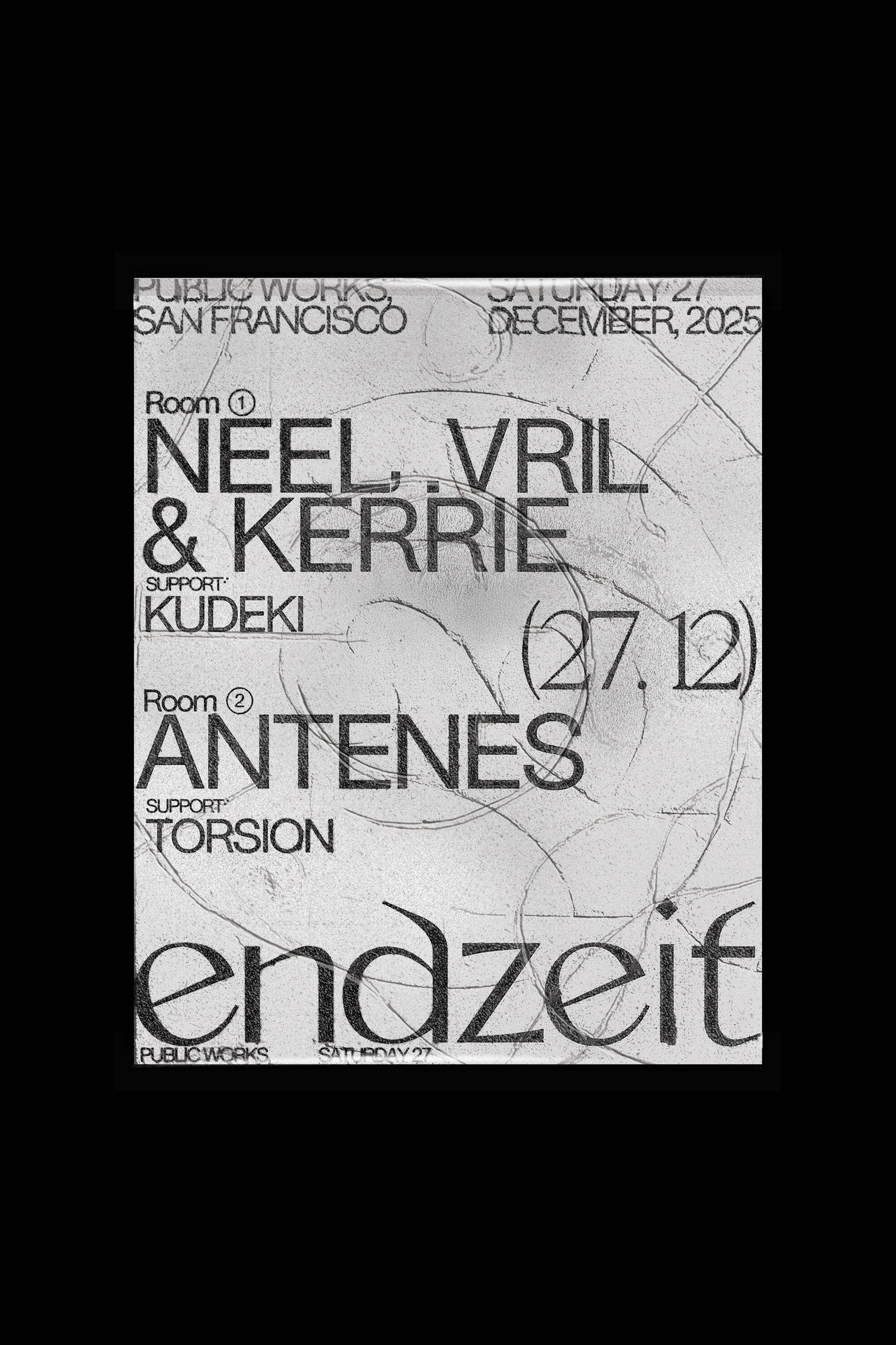Room 2 — Antenes (Extended Set) Antenes debuts at Endzeit with an extended set designed to evolve gradually. Support: Endzeit residents Kudeki and Torsion.